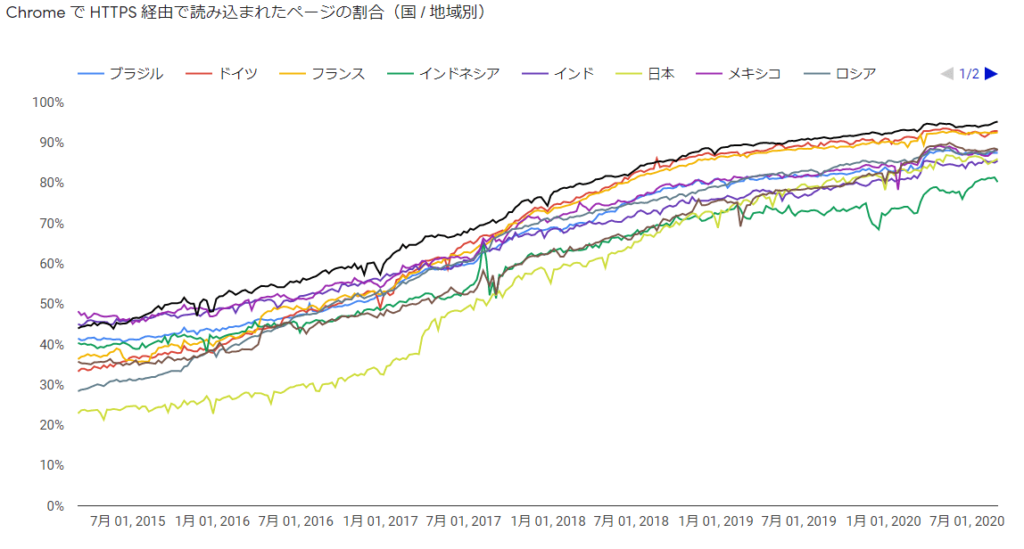 ウェブ上での HTTPS 暗号化というページでは、2020年8月のデータですが、かなり遅れを取っていた日本でも約85%のサイトでSSLに対応しているとのことでした。
