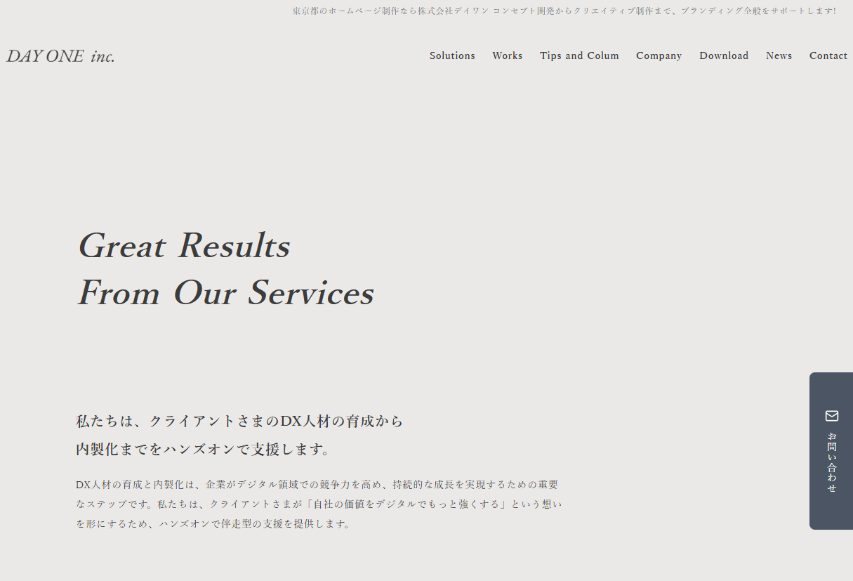株式会社デイワンは企業のデジタル変革を支援するパートナーとして、DX人材の育成や内製化支援、ブランディング、Webクリエイティブ制作など、多岐にわたるサービスを提供しています。